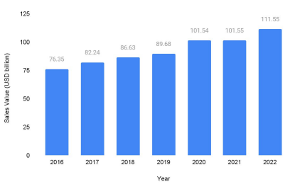O gráfico a seguir ilustra bem essa curva. Nos Estados Unidos, as vendas de alimentos e bebidas de marca própria passaram de US$ 76,3 bilhões em 2016 para US$ 111,5 bilhões em 2022. Projeções indicam que devem chegar a US$ 143,1 bilhões até 2029 (Data Bridge Market Research, 2023). E o avanço não para: apenas no primeiro semestre de 2023, as vendas cresceram 8,2% em valor, totalizando US$ 108 bilhões, puxadas por bebidas (+19%), alimentos gerais (+16%) e produtos refrigerados (+16%).